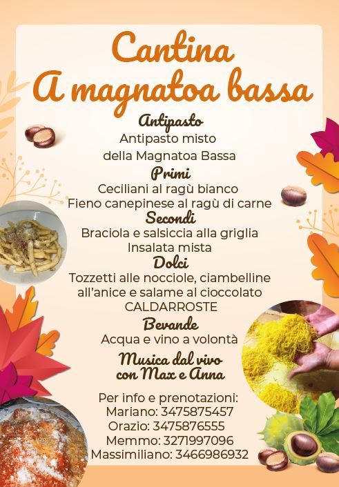 Serata di Halloween: presso la cantina “A magnatoa bassa” si terrà la cena mascherata a tema halloween con musica dal vivo. Il ricavato sarà devoluto in beneficenza. Il menù è consultabile tramite download in fondo alla pagina